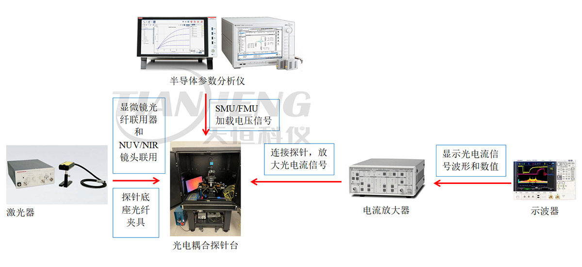 - 將外加光源引入探針臺顯微鏡接口,讓外加光從顯微鏡物鏡頭出射到樣品